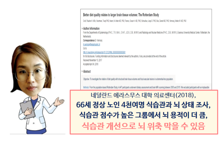 2018년 네덜란드 에라스무스대학 의료센터에서는 평균 66세 정상노인 4천여 명을 대상으로 식습관과 뇌 상태를 조사한 결과, 과일 · 채소 · 생선 · 유제품 · 견과류 · 올리브오일 등을 많이 먹고 식습관 점수가 높았던 그룹에서 뇌 용적이 더 큰 것을 발견하였습니다. 치매로 인해 인지능력이 떨어지면 뇌 용적이 작아지는 경향을 보지만 이 연구 결과는 식습관 개선으로 뇌 위축을 막을 수 있어 노인의 인지능력 향상에 도움을 준다는 분석이었습니다.