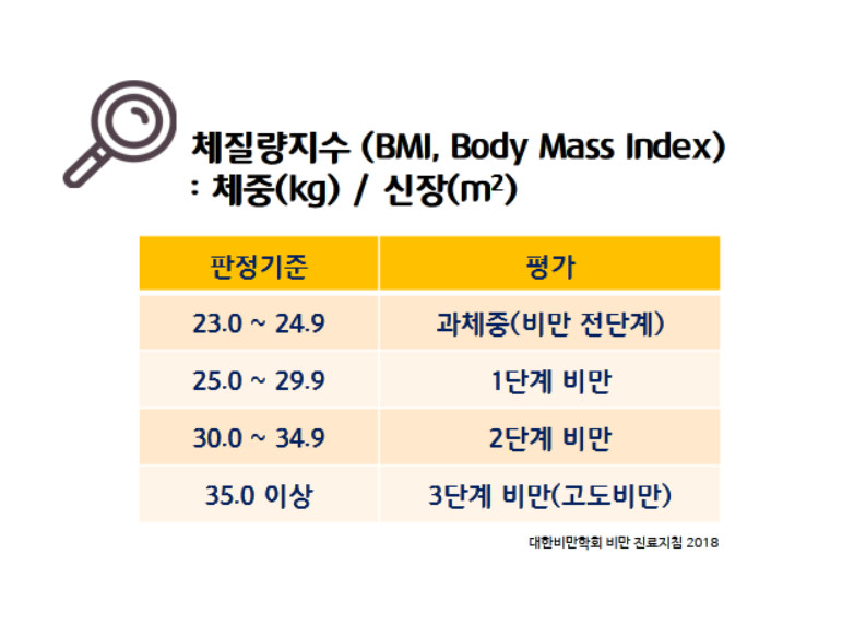 가장 쉬운 방법으로 키(신장)와 몸무게(체중)를 이용하여 계산하는 방법이 있습니다. 그것은 바로 체질량지수, BMI (Body Mass Index)인데요. 자신의 몸무게(kg)를 키의 제곱(m2)으로 나눈 값입니다. 그 값이 23~24.9이면 과체중(비만전단계)이고, 25~29.9는 1단계비만, 30~34.9는 2단계비만, 35이상은 고도비만으로 평가합니다 (출처:대한비만학회).