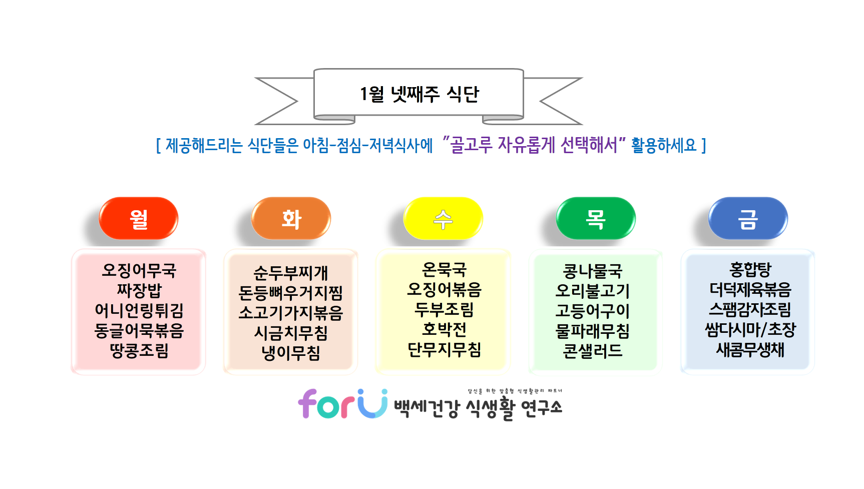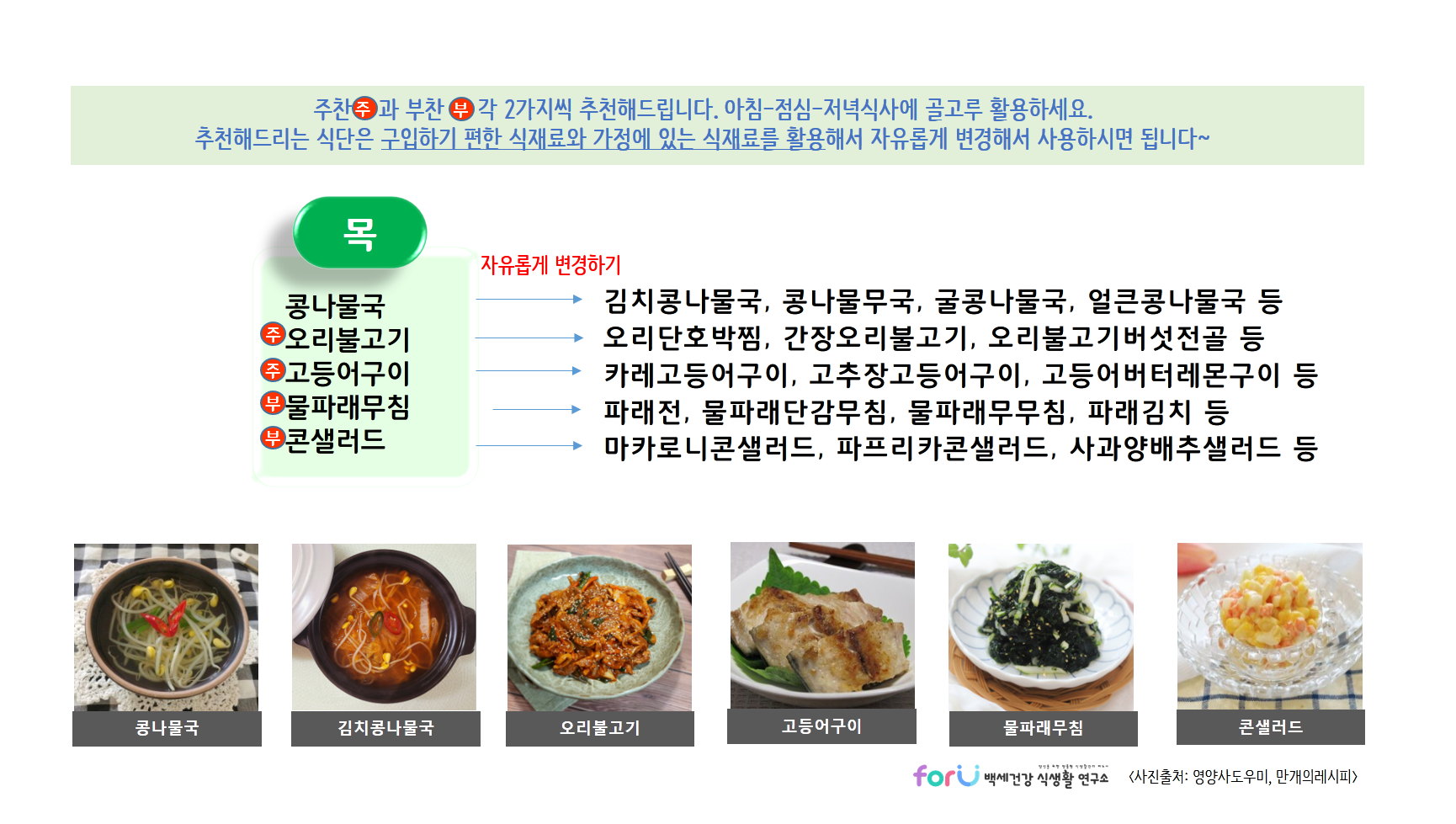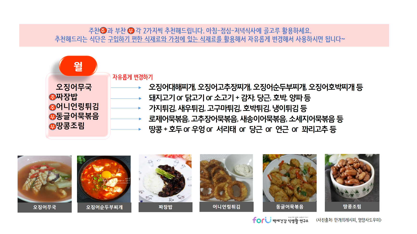 고민이 되신다면 저희 'forU 백세건강 식생활 연구소' 식단을 참고하셔서 간단하게~ 그리고 건강하게~ 준비하세요^^