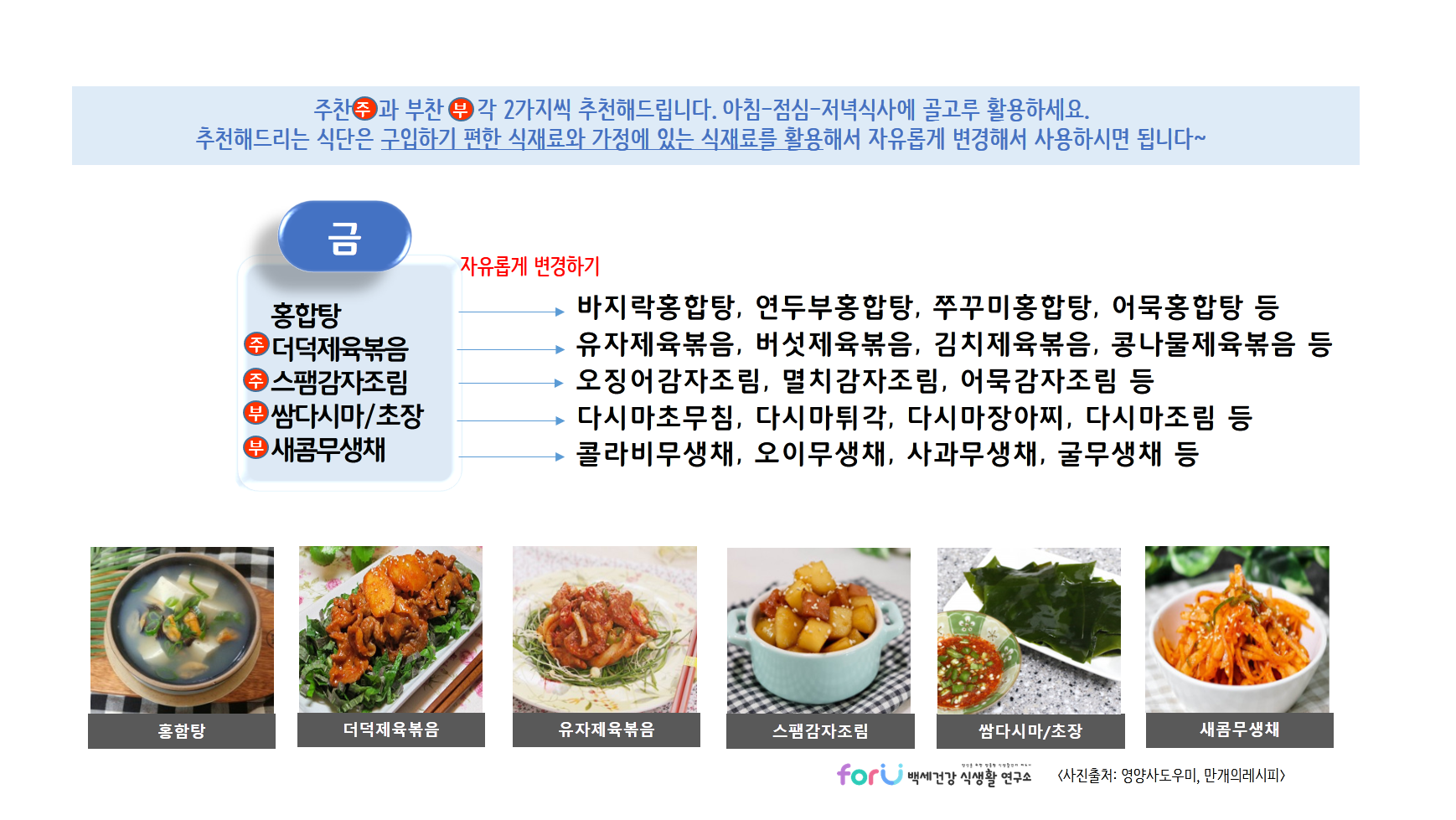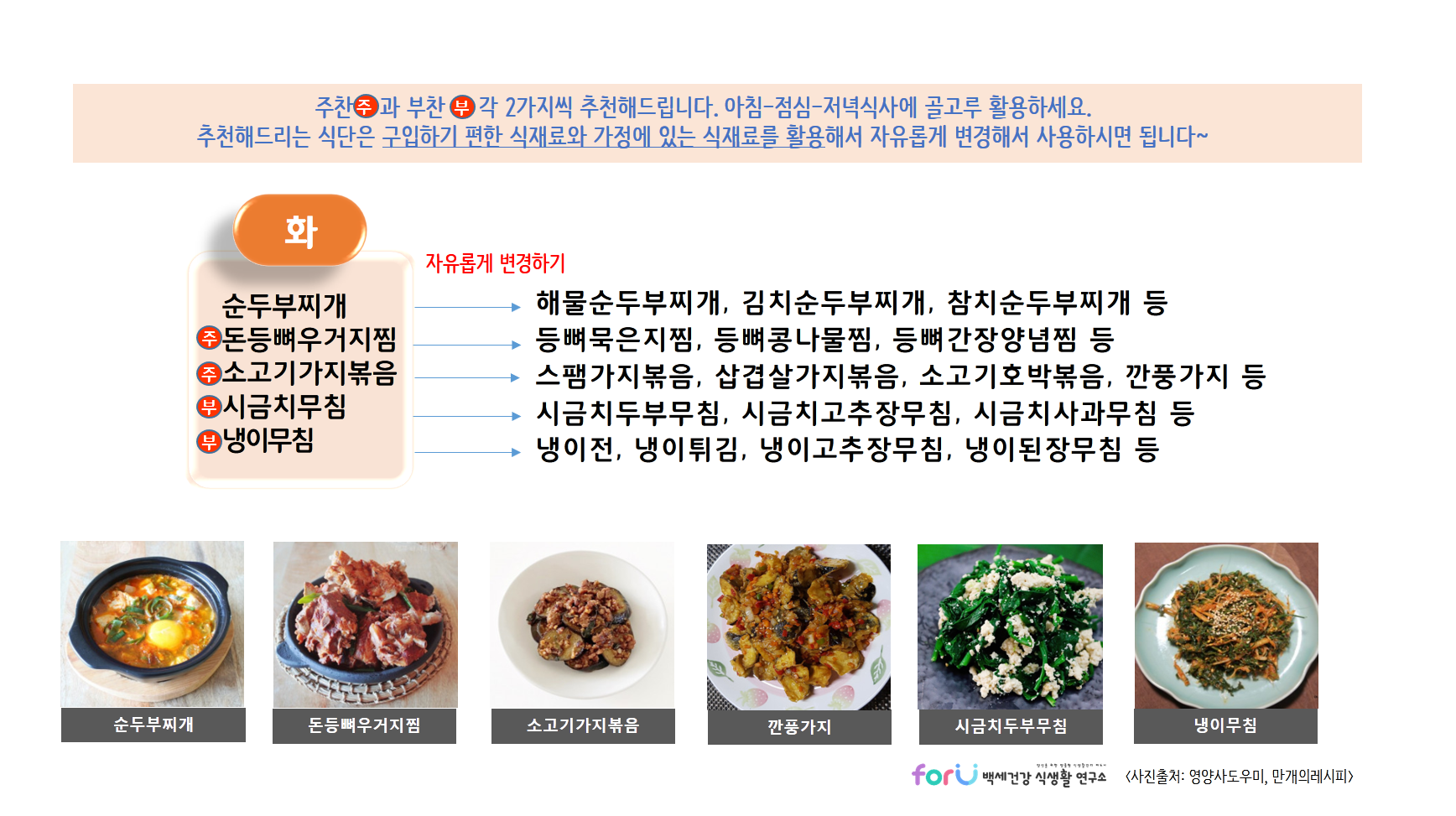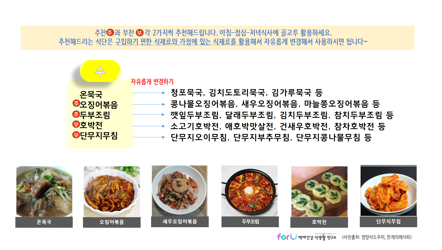 고민이 되신다면 저희 'forU 백세건강 식생활 연구소' 식단을 참고하셔서 간단하게~ 그리고 건강하게~ 준비하세요^^