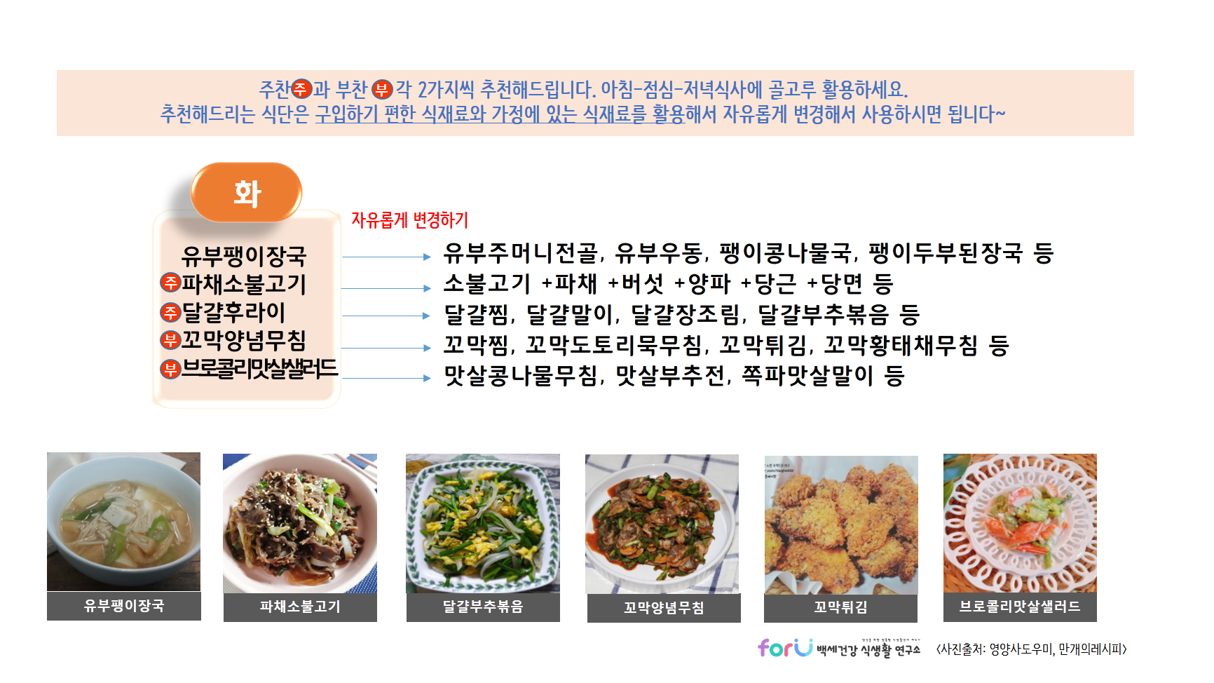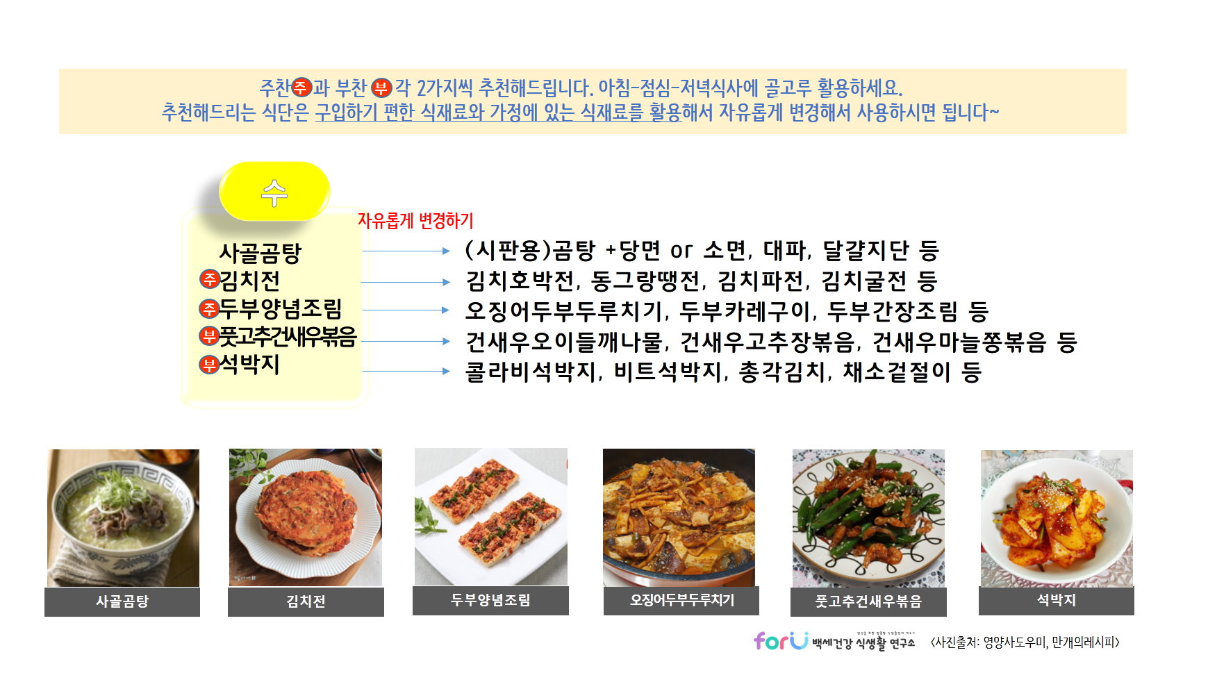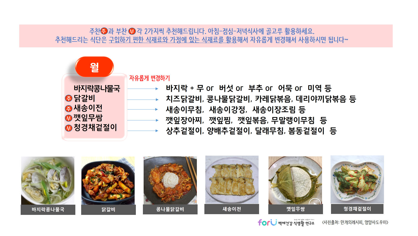 식단명을 보시고 집에 있는 재료를 활용하여 조리해보세요.