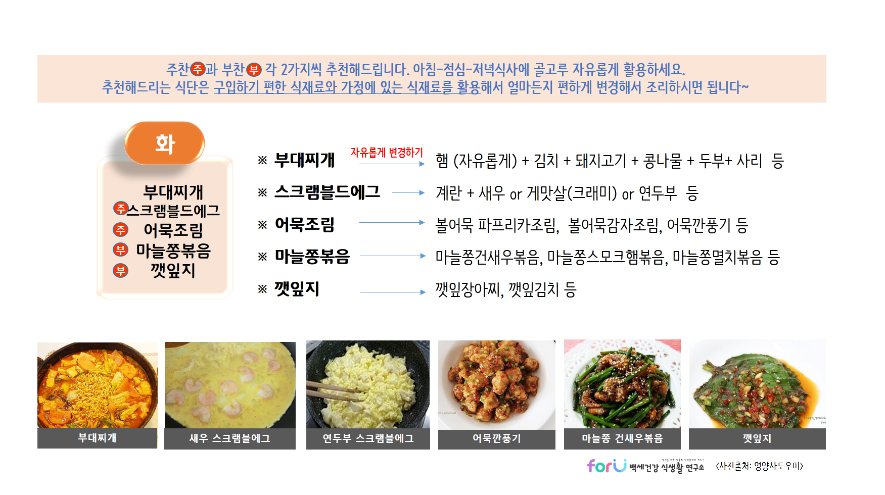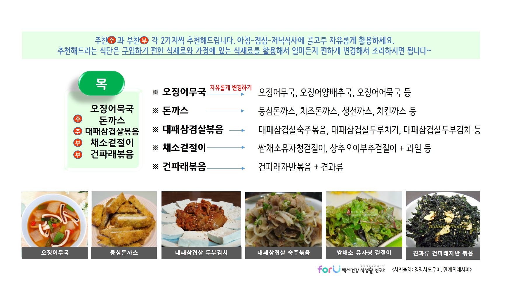 제공해드리는 식단들은 각 가정에서 구입하기 편하거나, 가지고 있는 식재료를 이용해서 자유롭게 변경하여 활용하시면 될것 같아요~ 있는 재료와 조리하실 수 있는 범위 내에서 편하게 활용하세요~
