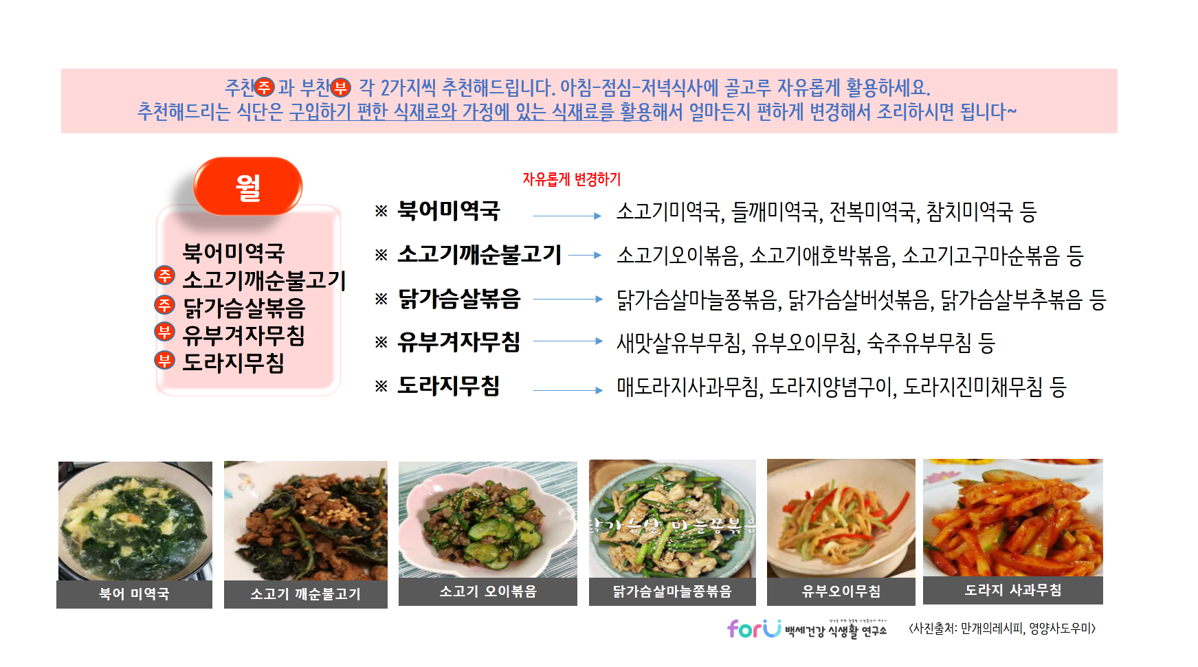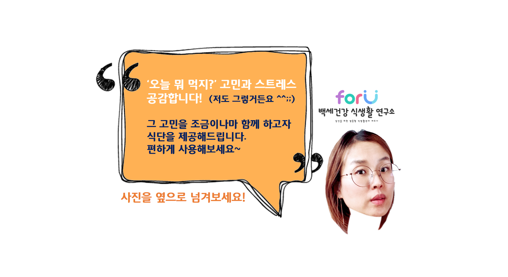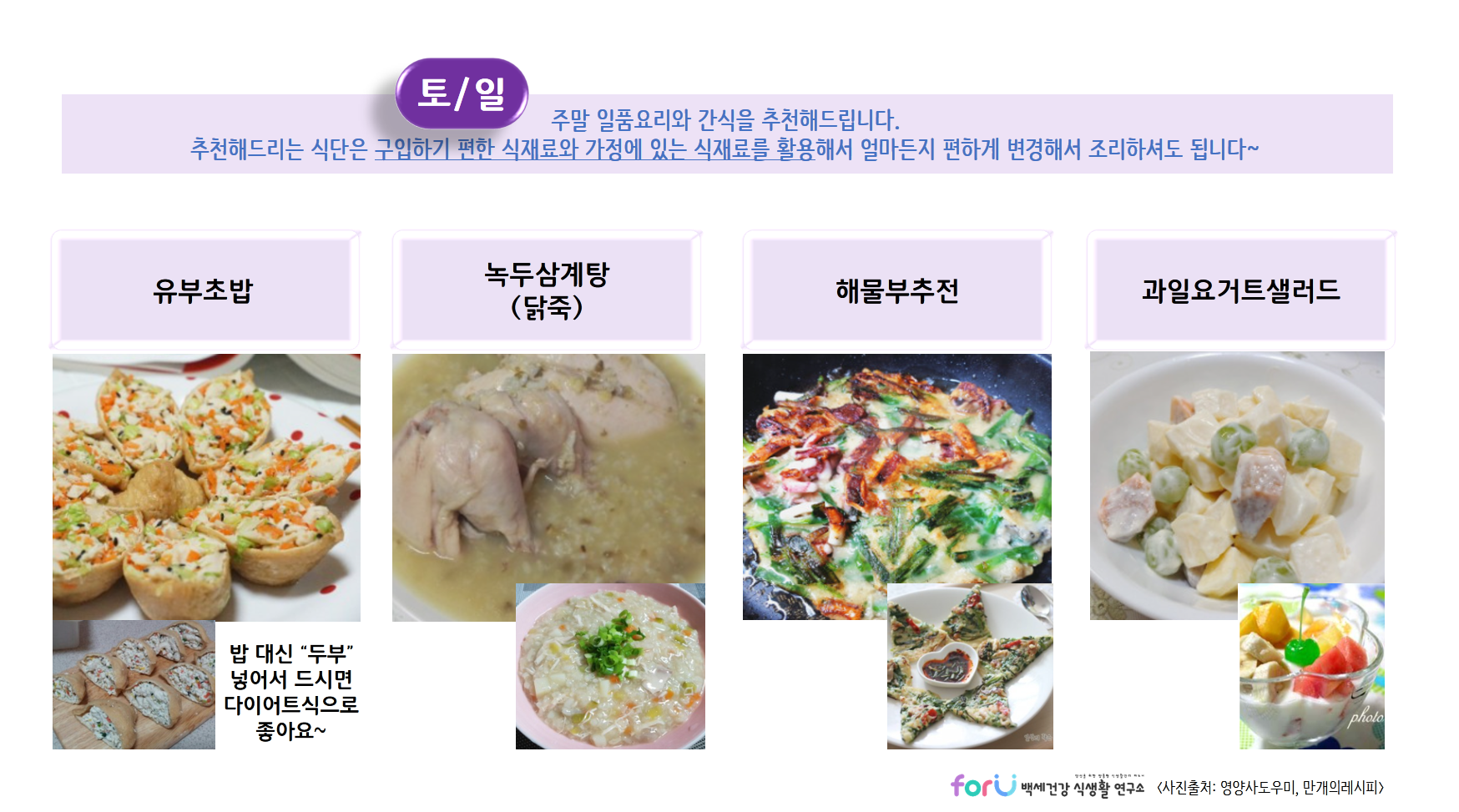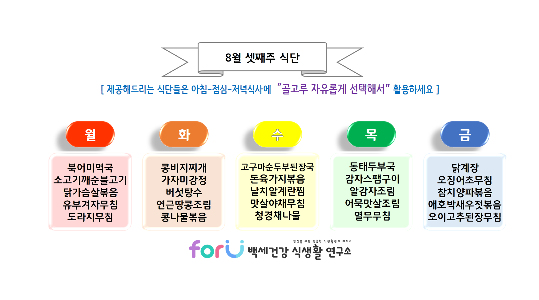 저희 'forU 백세건강 식생활 연구소'는 여러분의 건강식단을 언제나 응원합니다.