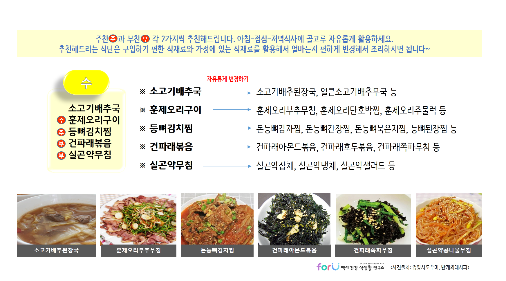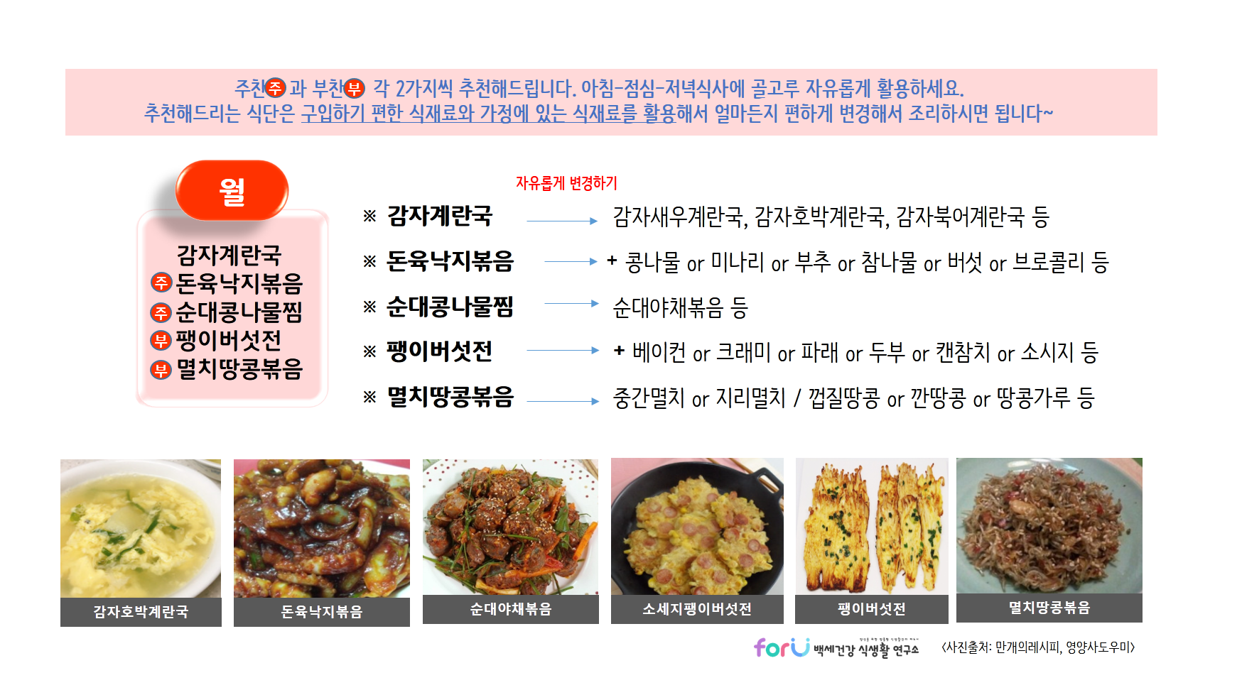 제공해드리는 식단들은 각 가정에서 구입하기 편하거나, 가지고 있는 식재료를 이용해서 자유롭게 변경하여 활용하시면 될것 같아요~ 있는 재료와 조리하실 수 있는 범위 내에서 편하게 활용하세요~