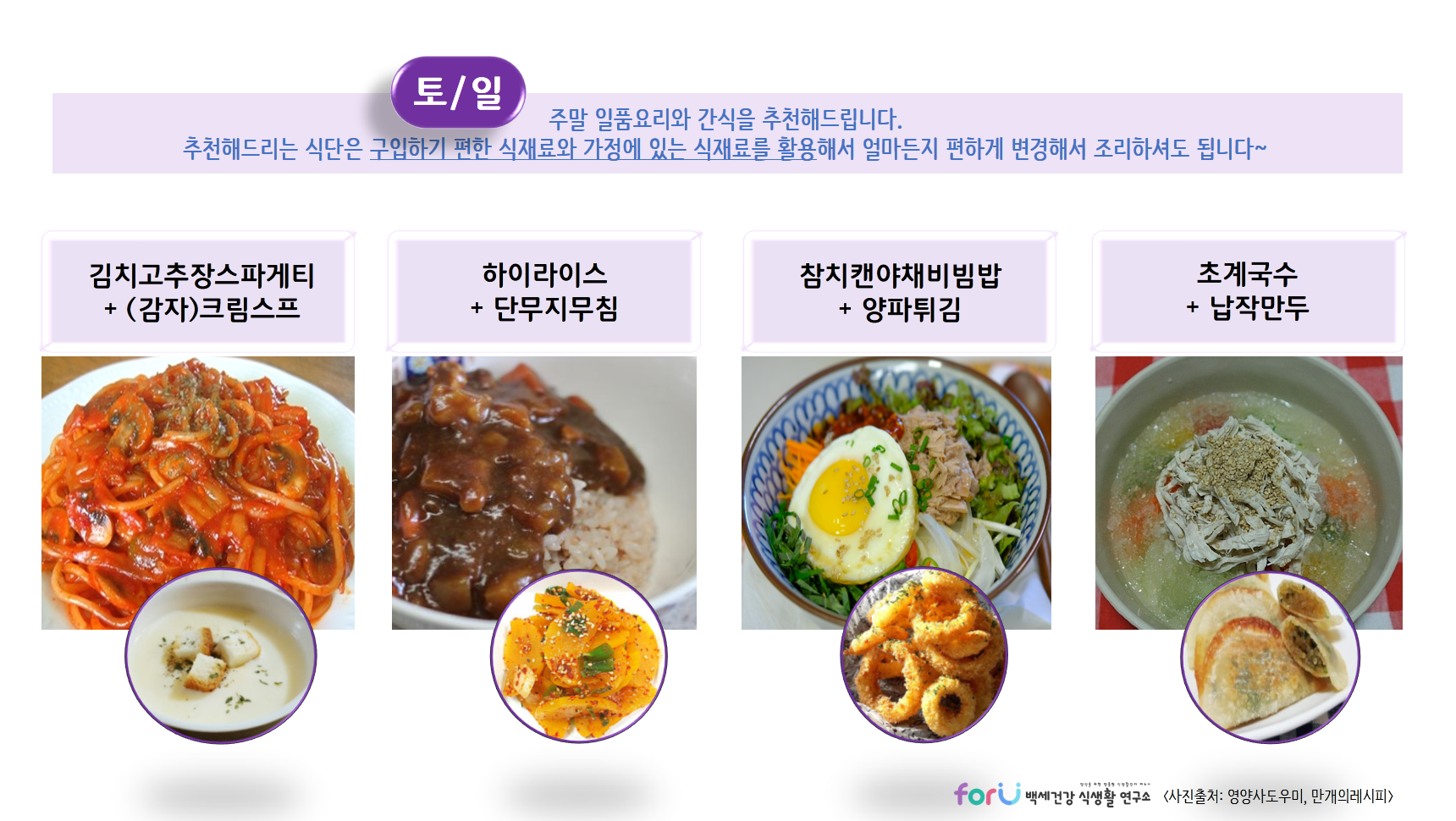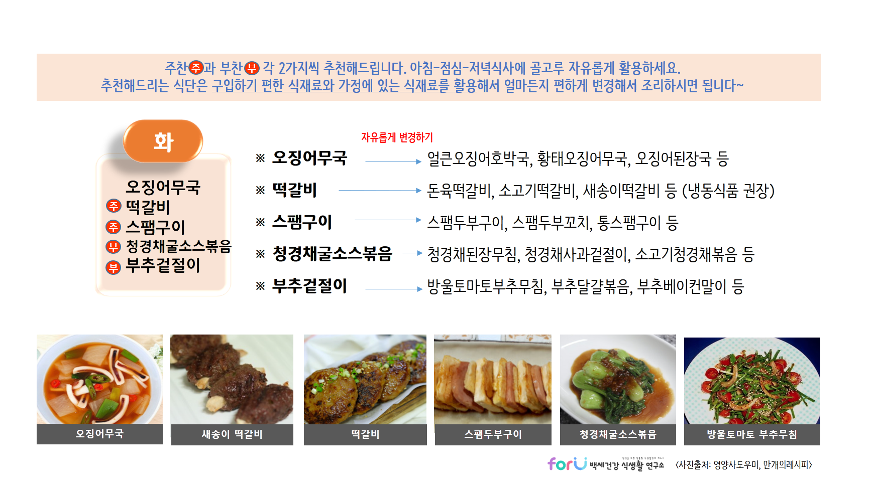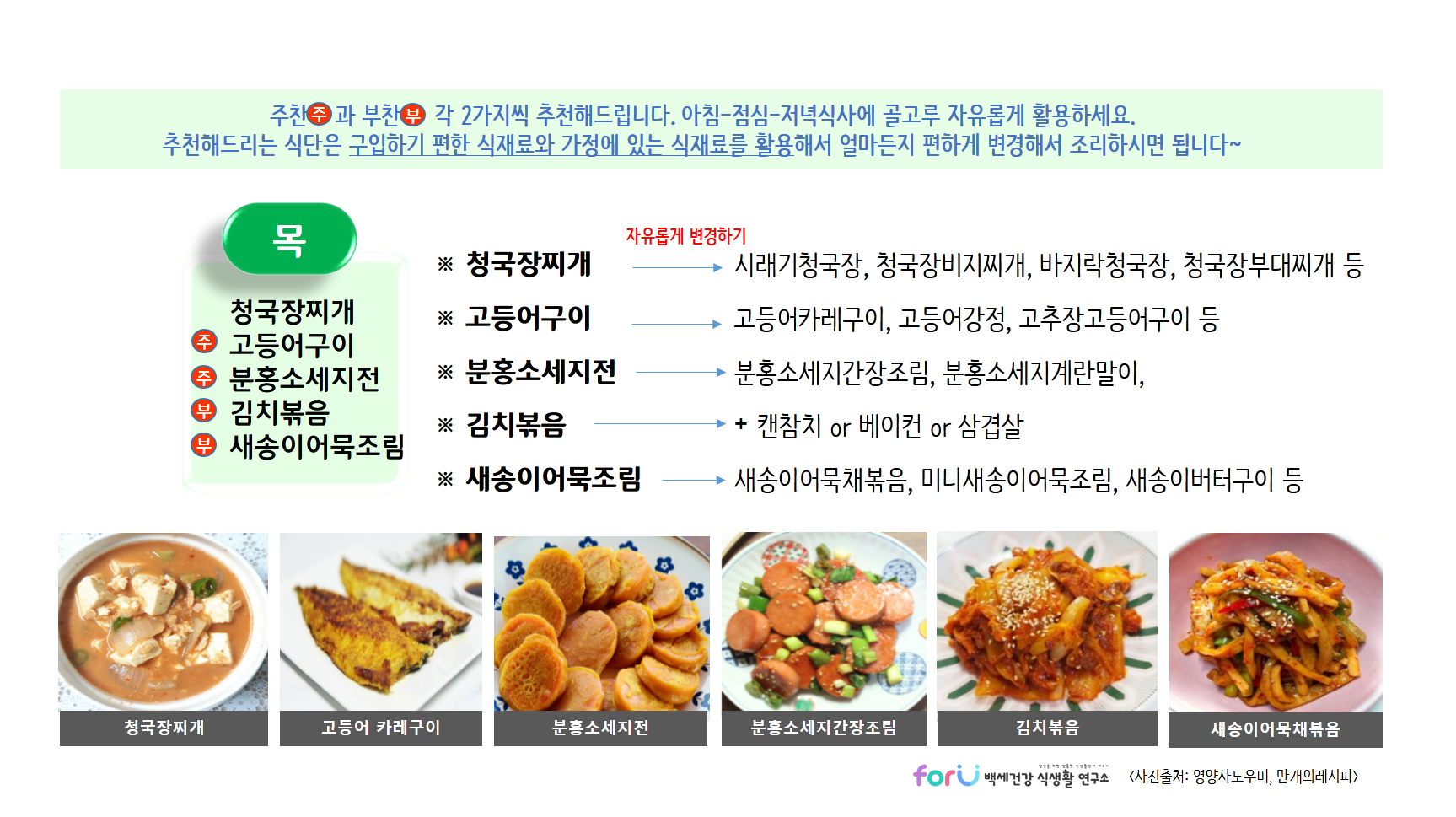 제공해드리는 식단들은 각 가정에서 구입하기 편하거나, 가지고 있는 식재료를 이용해서 자유롭게 변경하여 활용하시면 될것 같아요~ 있는 재료와 조리하실 수 있는 범위 내에서 편하게 활용하세요~