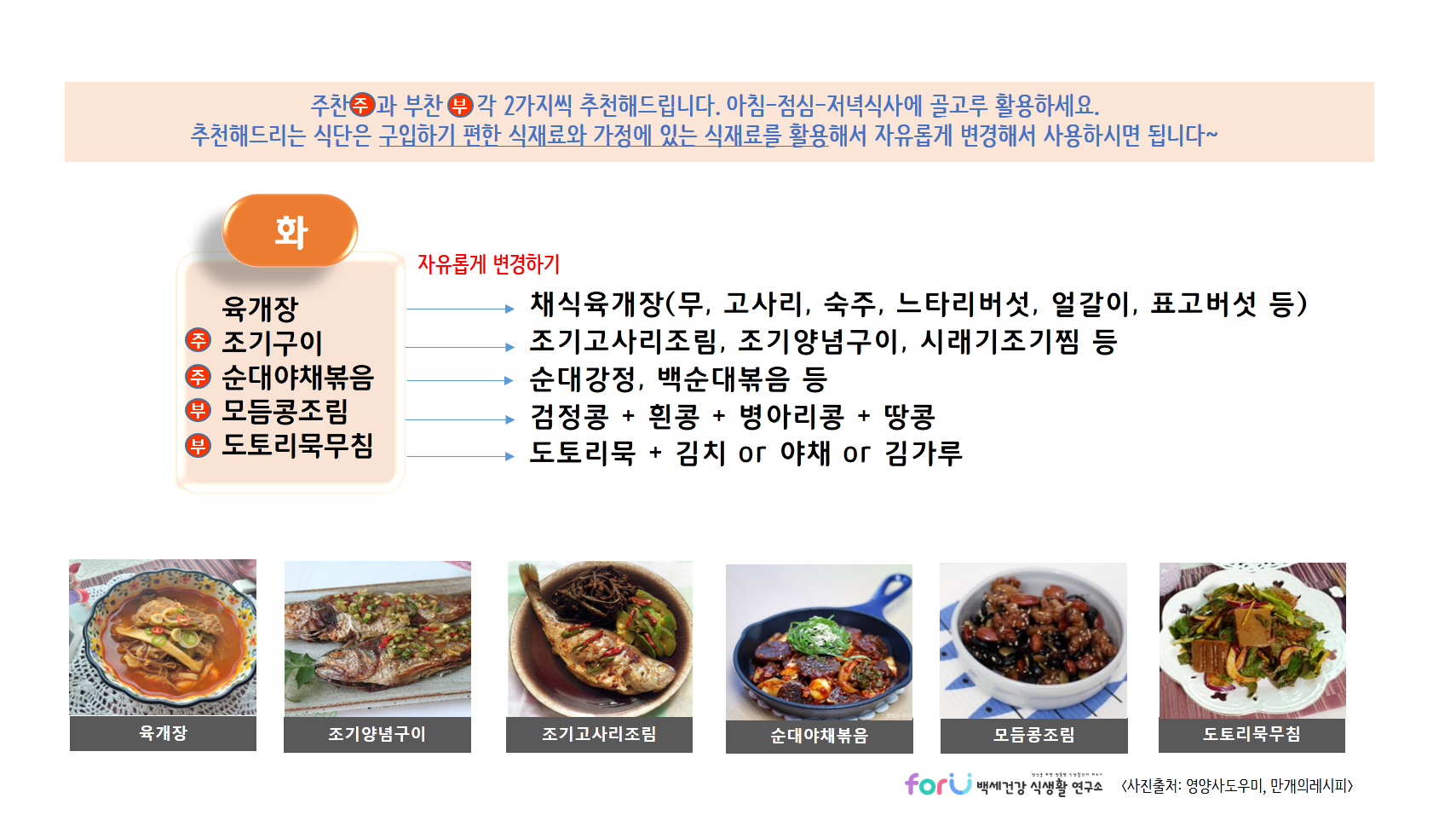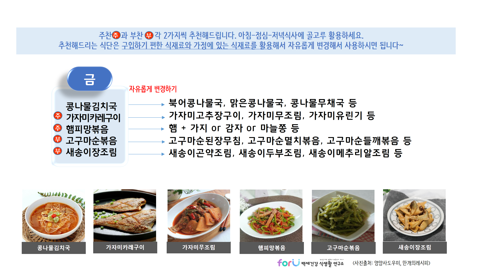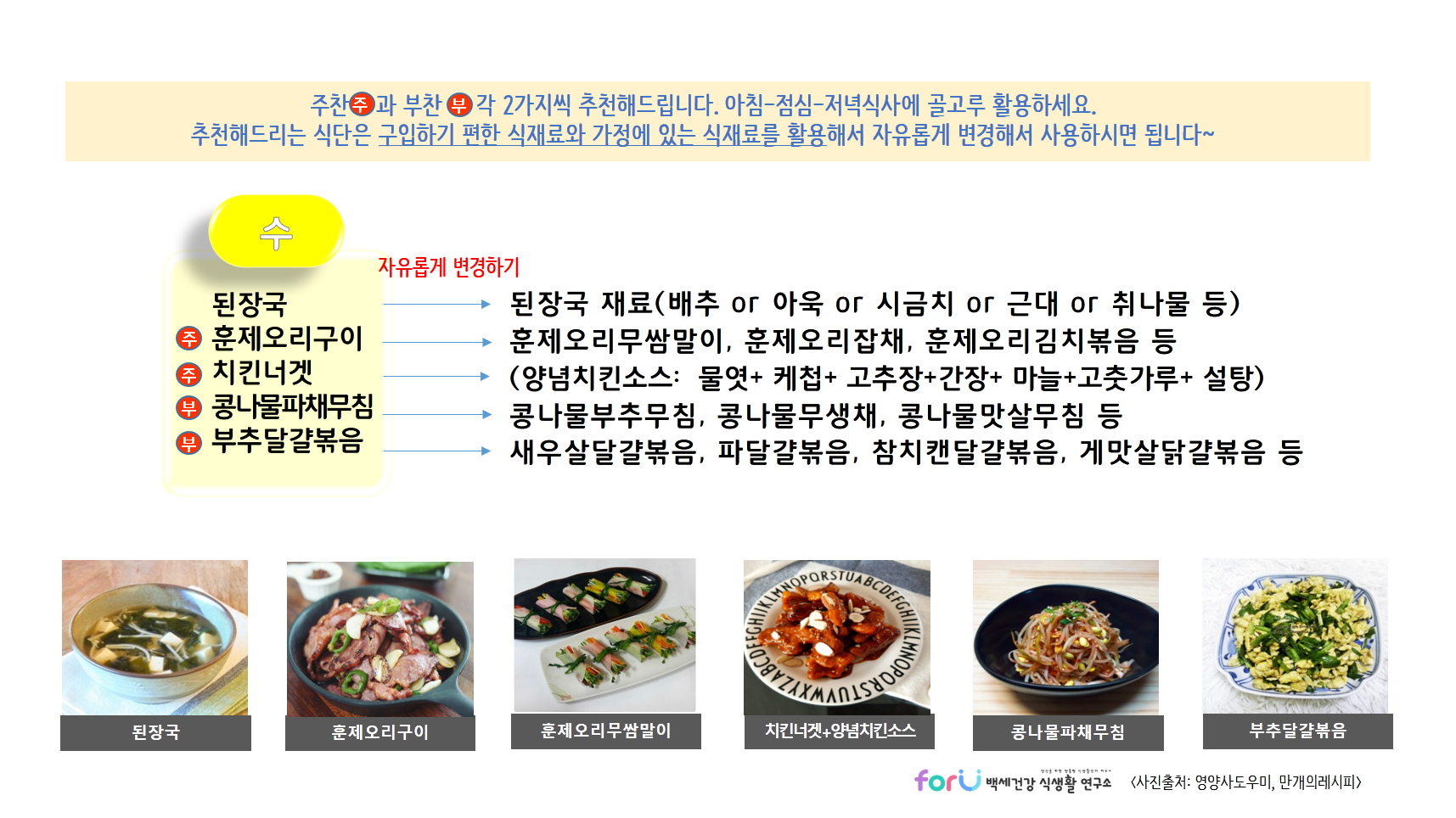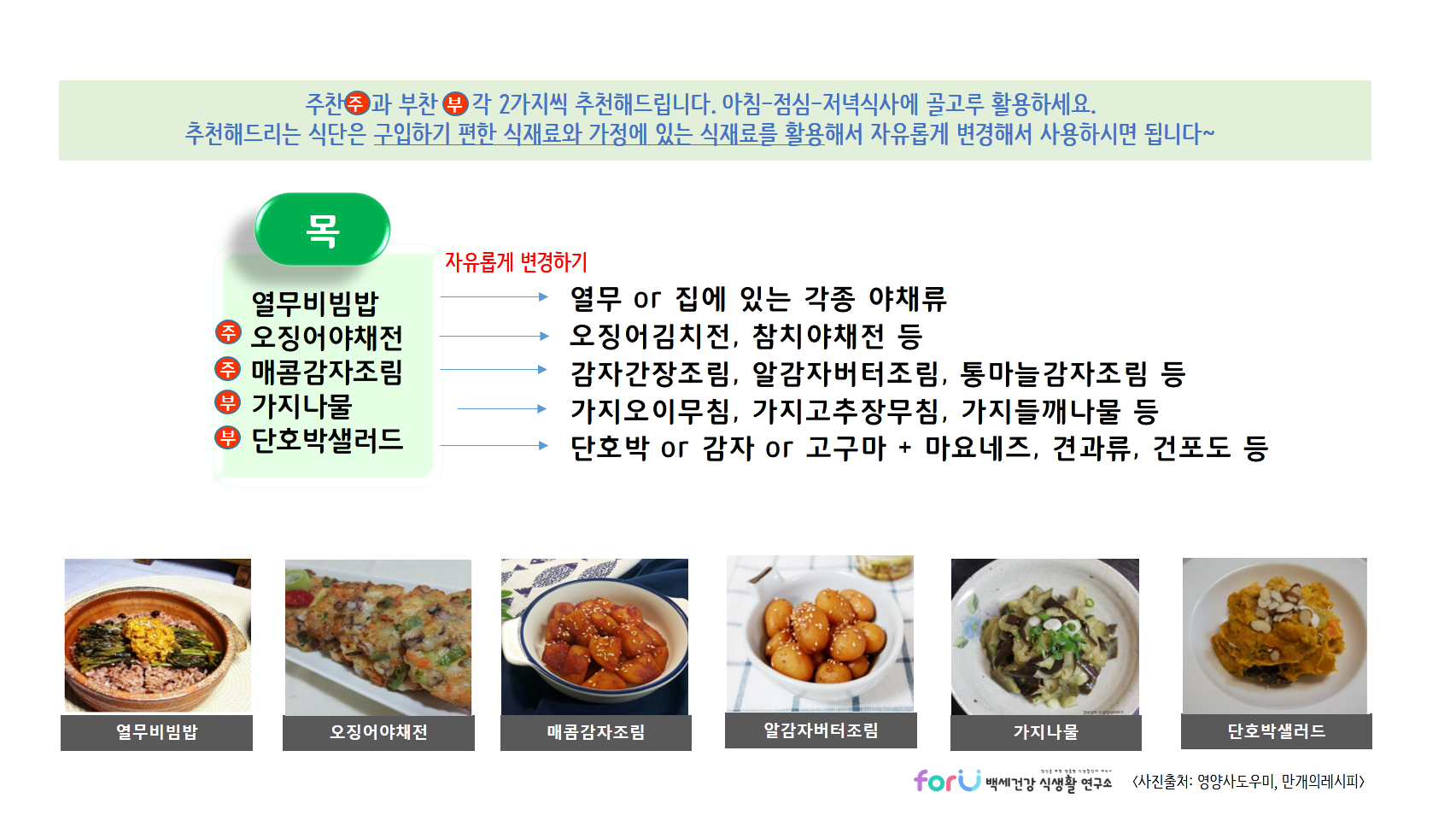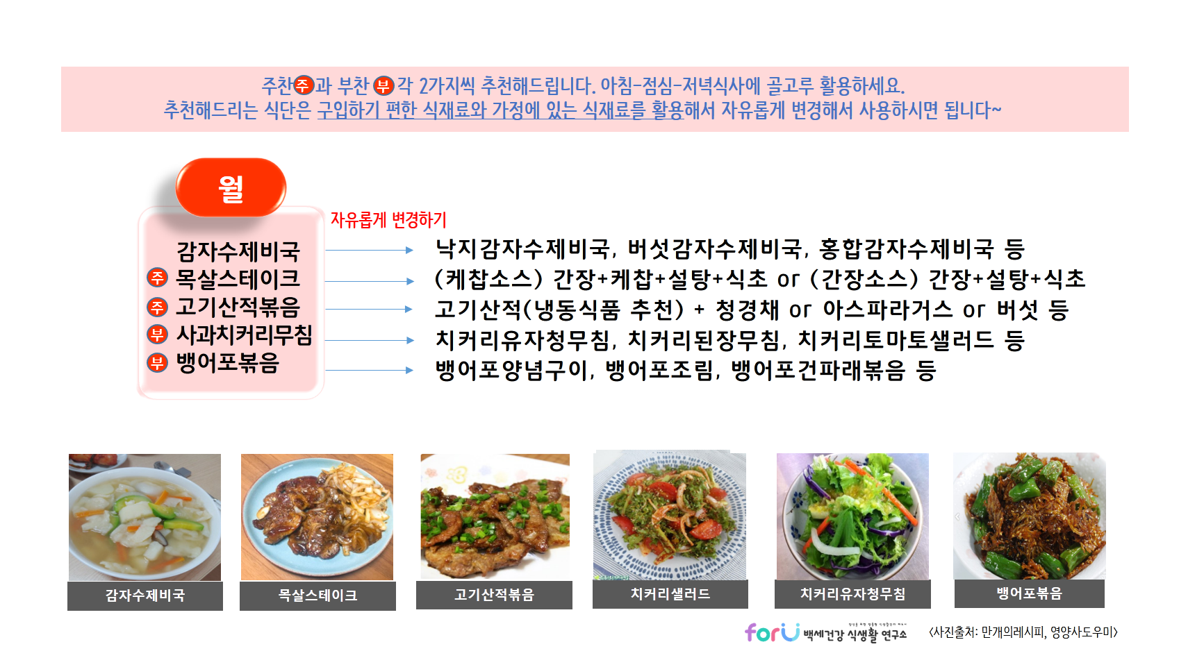 * 제공드리는 식단들은 각 가정에서 구입하기 편하거나 가지고 있는 식재료를 이용해서 자유롭게 변경해서 활용하세요~