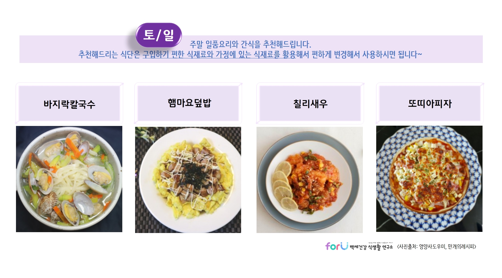 * 제공드리는 식단들은 각 가정에서 구입하기 편하거나 가지고 있는 식재료를 이용해서 자유롭게 변경해서 활용하세요~