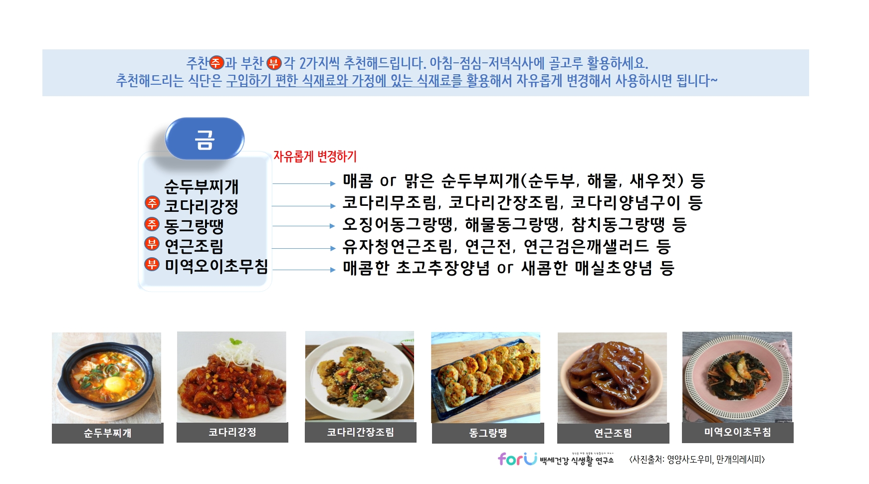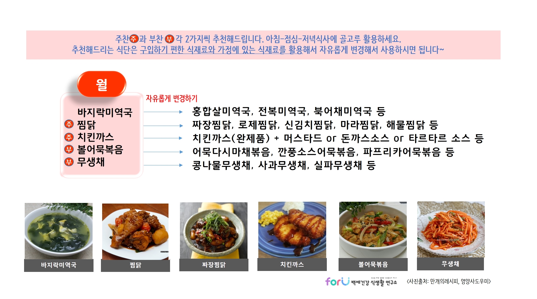* 제공드리는 식단들은 각 가정에서 구입하기 편하거나 가지고 있는 식재료를 이용해서 자유롭게 변경해서 활용하세요~