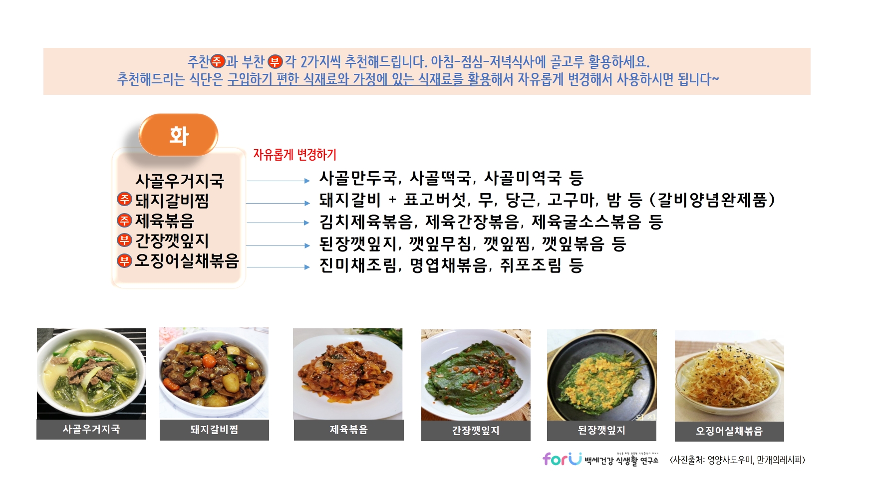 * 사진을 옆으로 넘기면 요일별로 응용가능한 여러가지 식단들이 보입니다. 참고하세요!