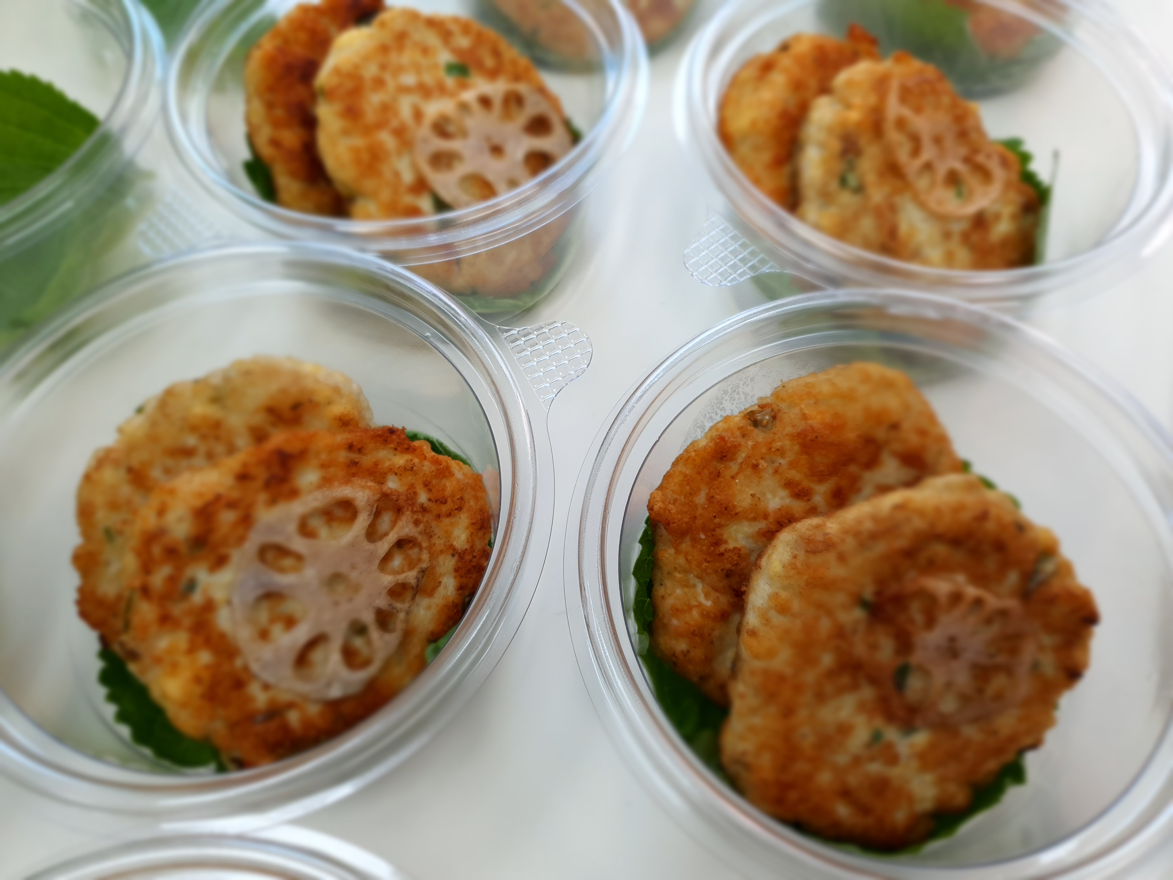 * 연근두부스테이크: 닭고기안심과 두부를 이용하여 부드럽게 만든 스테이크로 어르신들에게 단백질을 보충하기에 좋은 반찬입니다. 반죽에 갈아넣어서 첨가한 연근은 식이섬유소, 타닌, 비타민C, 칼륨 등의 영양소가 풍부하여 각각 변비예방, 항산화작용, 미용효과, 고혈압예방에 도움을 줍니다.