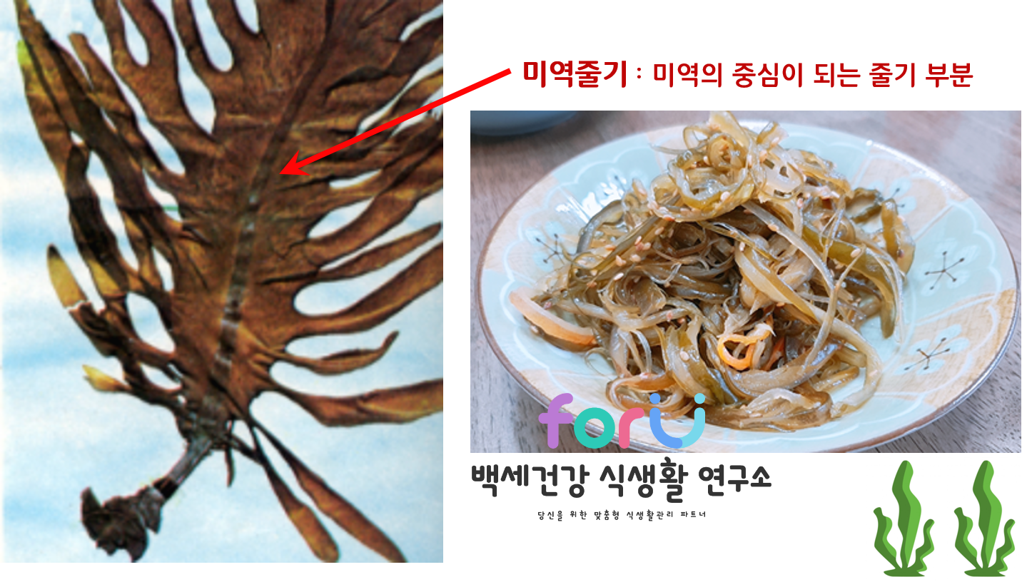 미역줄기는 해조류 중 '갈조류'에 해당되고, 그림에서 보듯 미역의 중심이 되는 줄기부분으로 독특한 향과 쫄깃하고 씹는 맛이 특징입니다. 열량은 낮고 식이섬유소와 알긴산이 풍부해 대장기능 개선에 도움이 되고, 비타민 B와 비타민 C, 칼슘, , 철이 풍부하여 빈혈과 뼈 건강에도 도움이 되는 등 간단한 밑반찬으로써 영양적 가치가 있습니다.