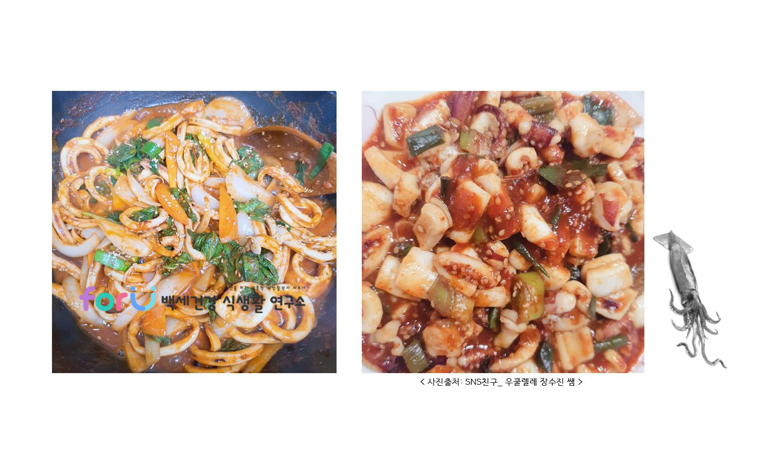 오징어는 비교적 칼로리가 낮은 (100g당 70-80 kcal) 식재료입니다. 또한 여러 가지 영양성분 중에서 특히 피로회복에 도움이 되는 “타우린”을 함유한 식품으로도 유명하지요. 타우린은 제가 워낙 찐 팬이라 자주 소개해드리는데요. 피로회복, 면역력강화, 항산화, 항염증, 혈당 및 혈중지질 저하, 간세포보호 등 매우 다양한 효능이 있는 것으로 밝혀져 있고, 최근에는 뇌기능관련 효과들까지도 계속해서 발표되고 있는 아미노산의 일종입니다. 많이 먹어도 무해하기 때문에 특히 해산물을 통한 꾸준한 타우린 섭취를 권장합니다.