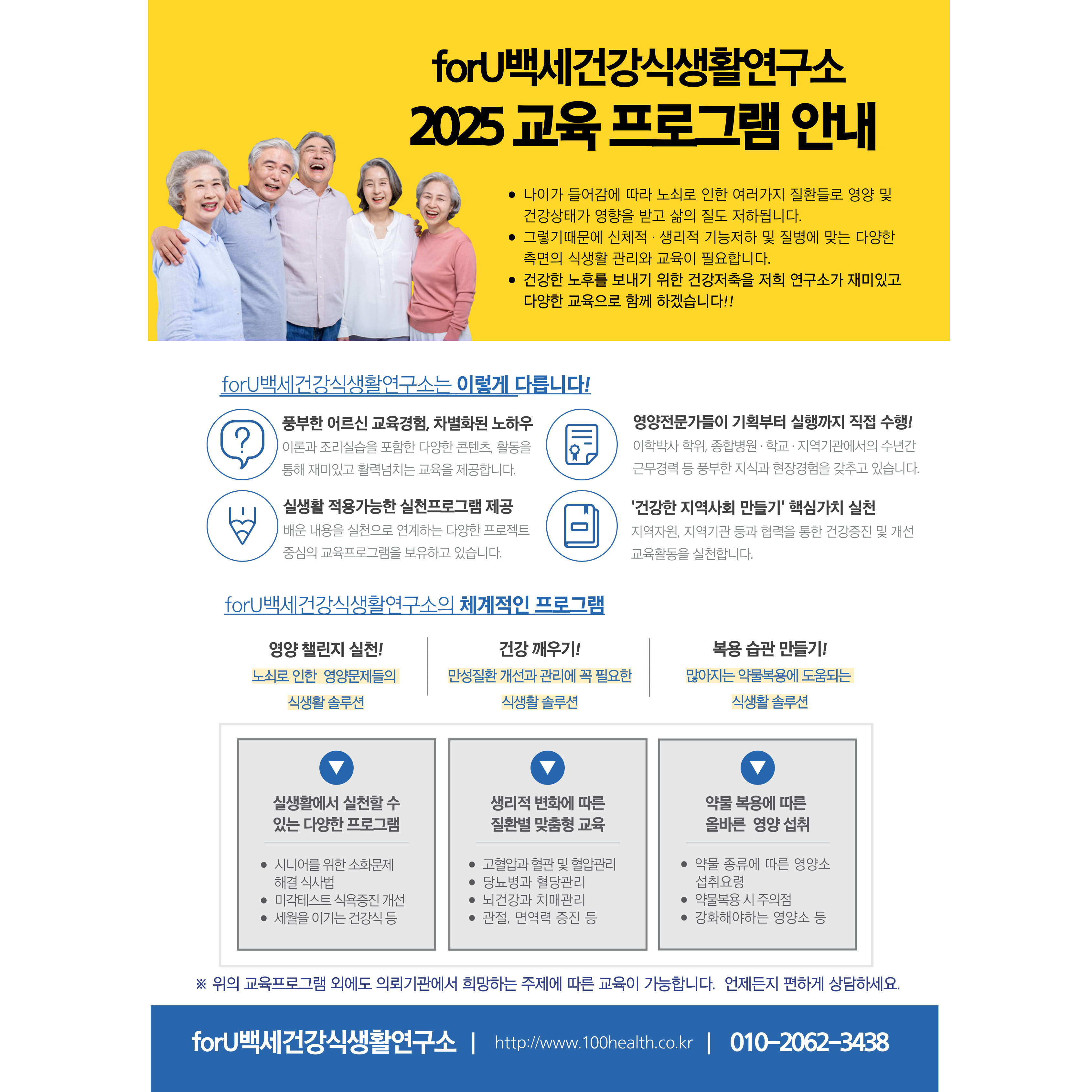 * 만성질환 관리교육: 고혈압, 당뇨병, 치매 등 노인성질환별 맞춤형 교육